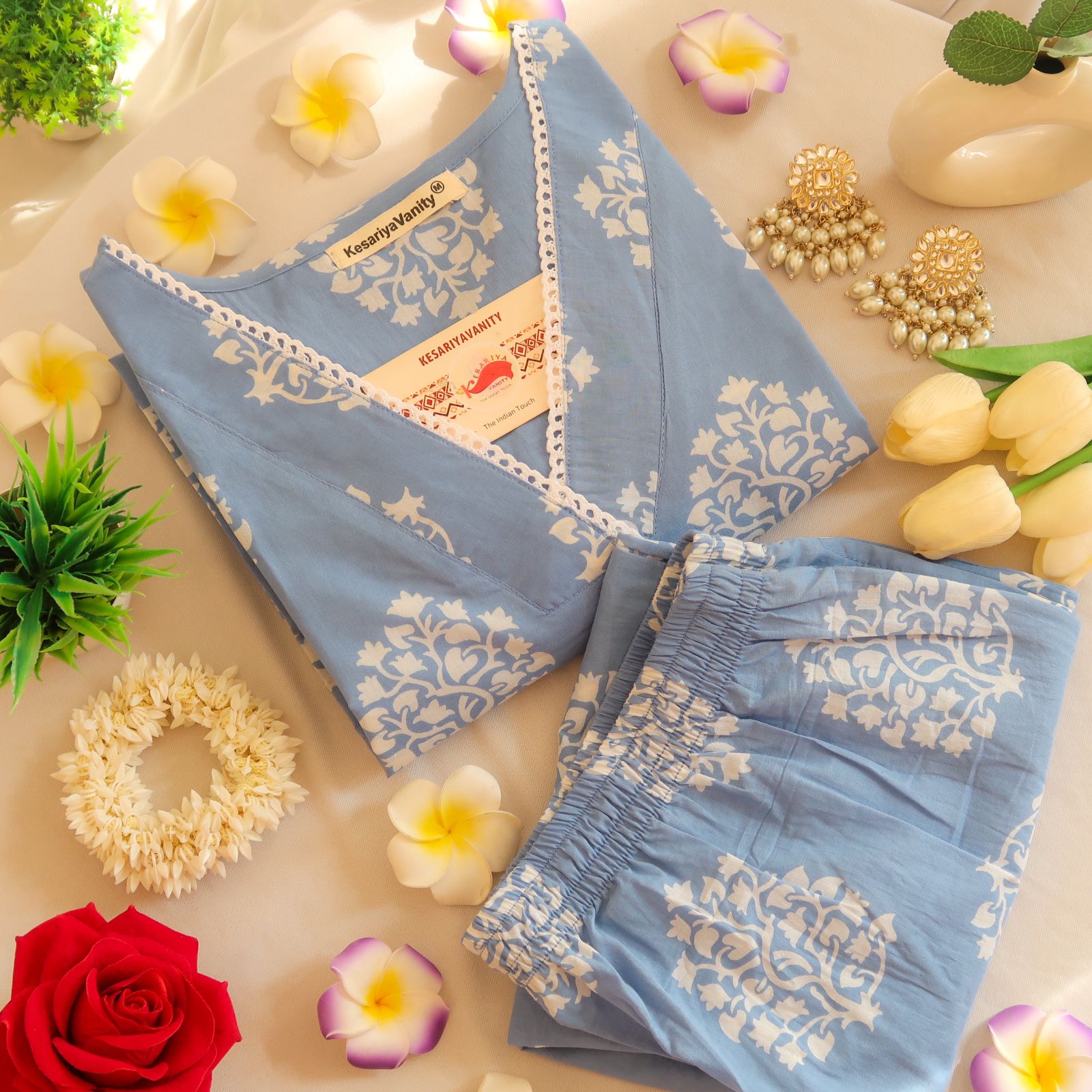 The kurta, fashioned in a chic straight style, features a serene light blue base adorned with intricate white floral motifs, reminiscent of delicate petals dancing in the breeze. Each motif is meticulously printed, creating a mesmerizing tapestry of natural charm and understated sophistication.