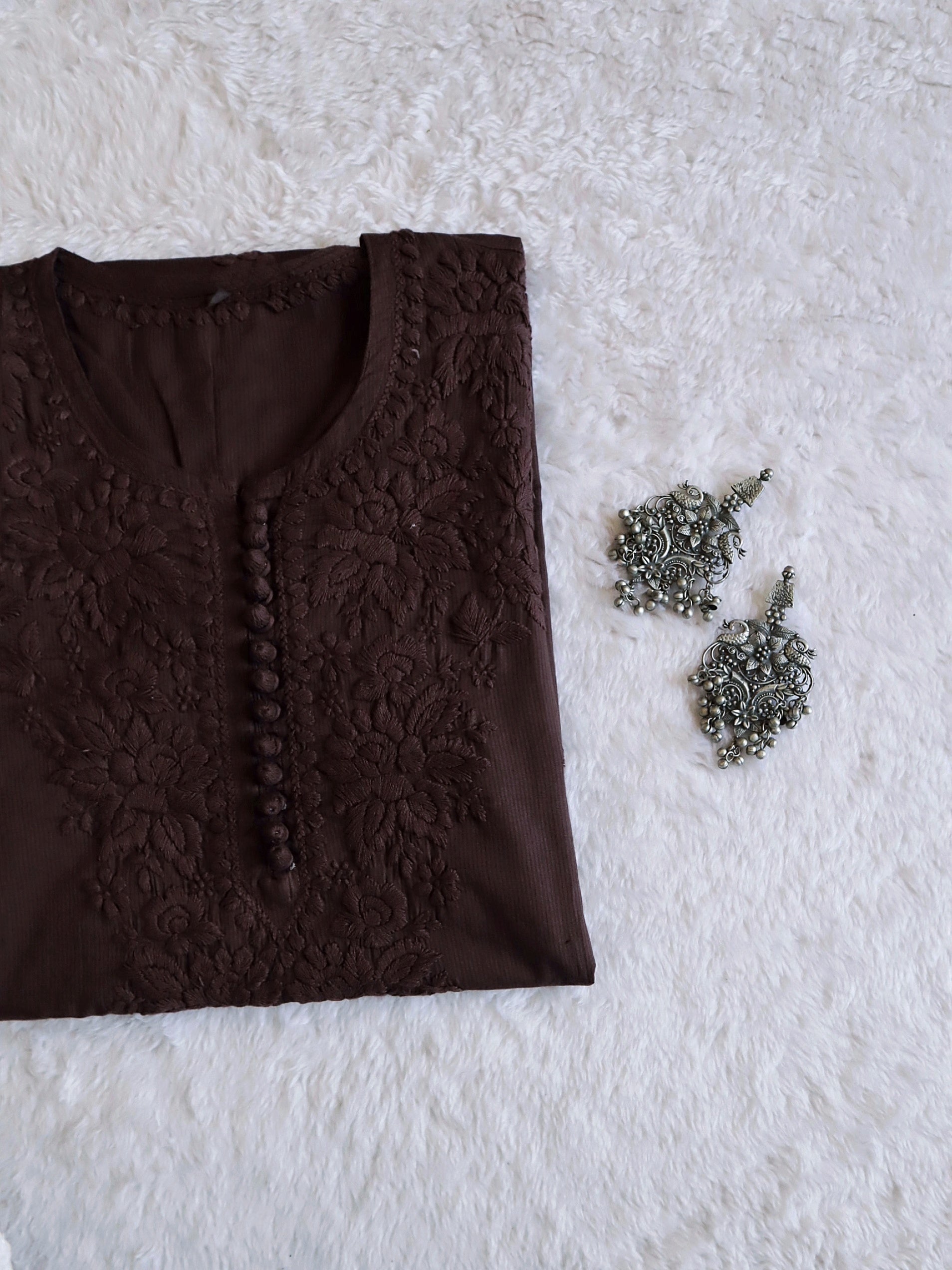 Chocolate Brown cotton kurta with chikankari handwork in Paisley and Floral pattern with beautiful crotia buttons in the front to elevate the look. It's a really Serene kurta from our Aayat premium collection with beautiful details! It's perfect and is made for everyone.