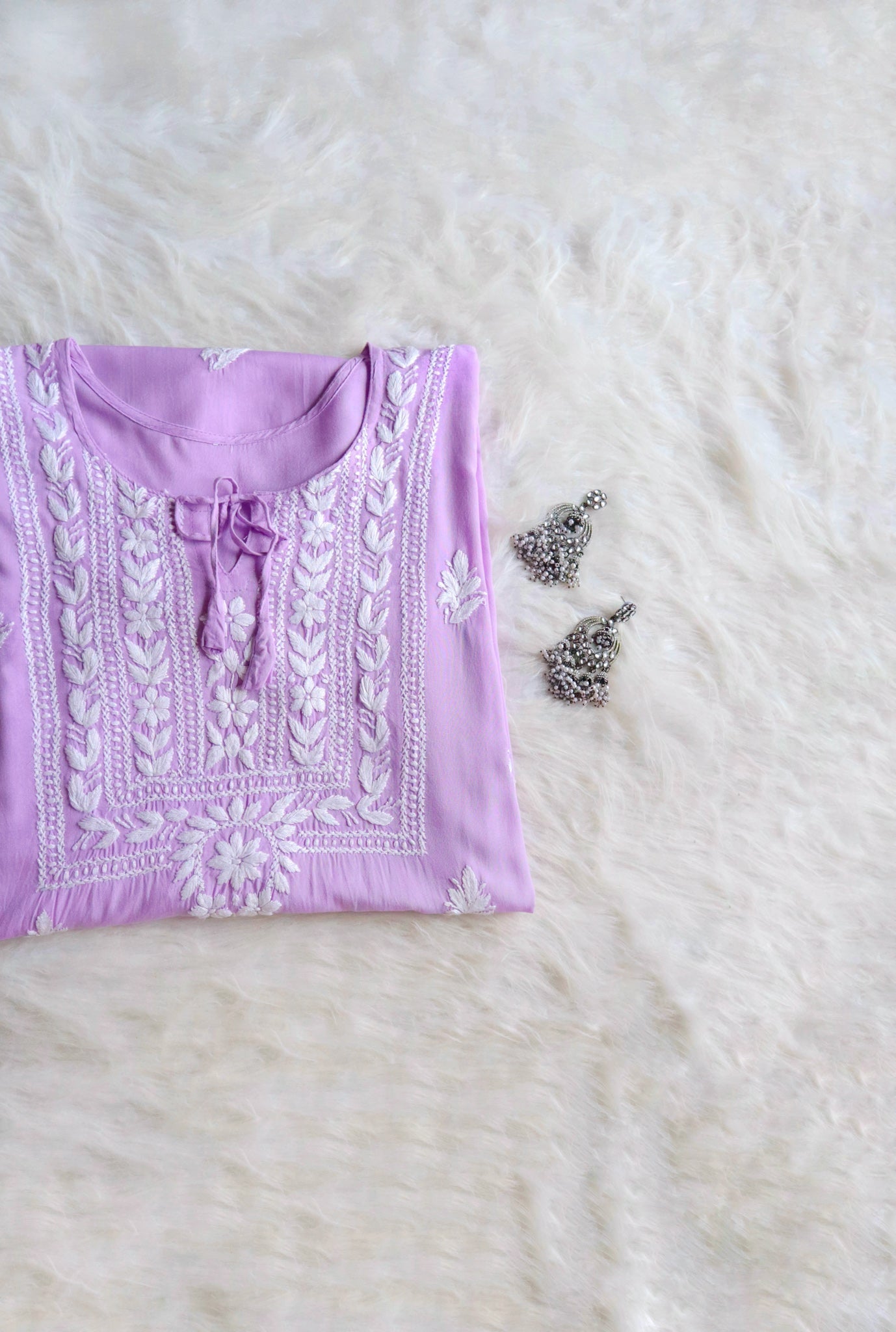 Lavender Long Rayon top with chikankari handwork in Paisley and Floral pattern. It's a really Stylish top with beautiful Lace details and comfort!