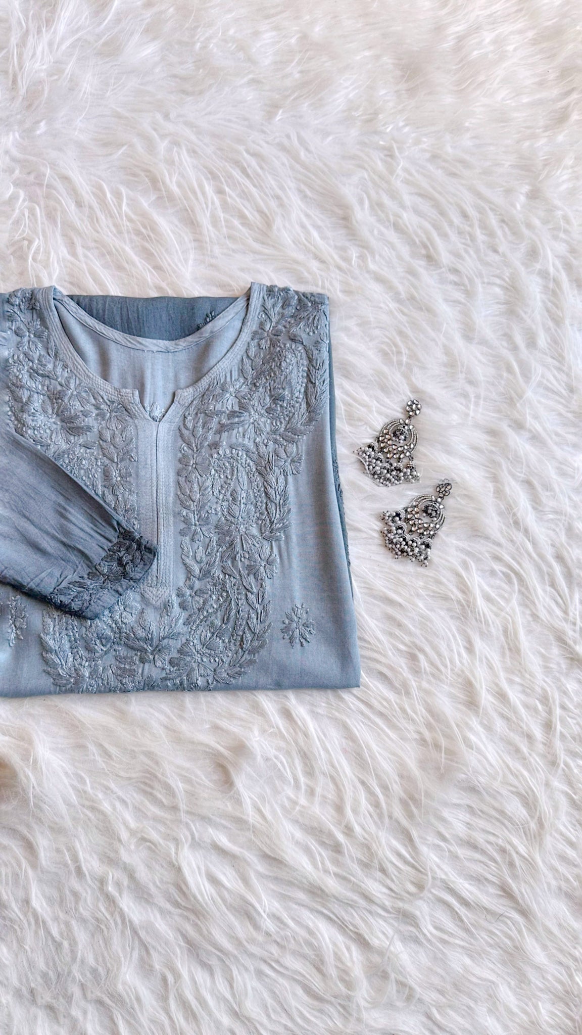 Grey Ombre Long Rayon top with chikankari handwork in Paisley and Floral pattern. It's a really Stylish top with beautiful details and comfort!