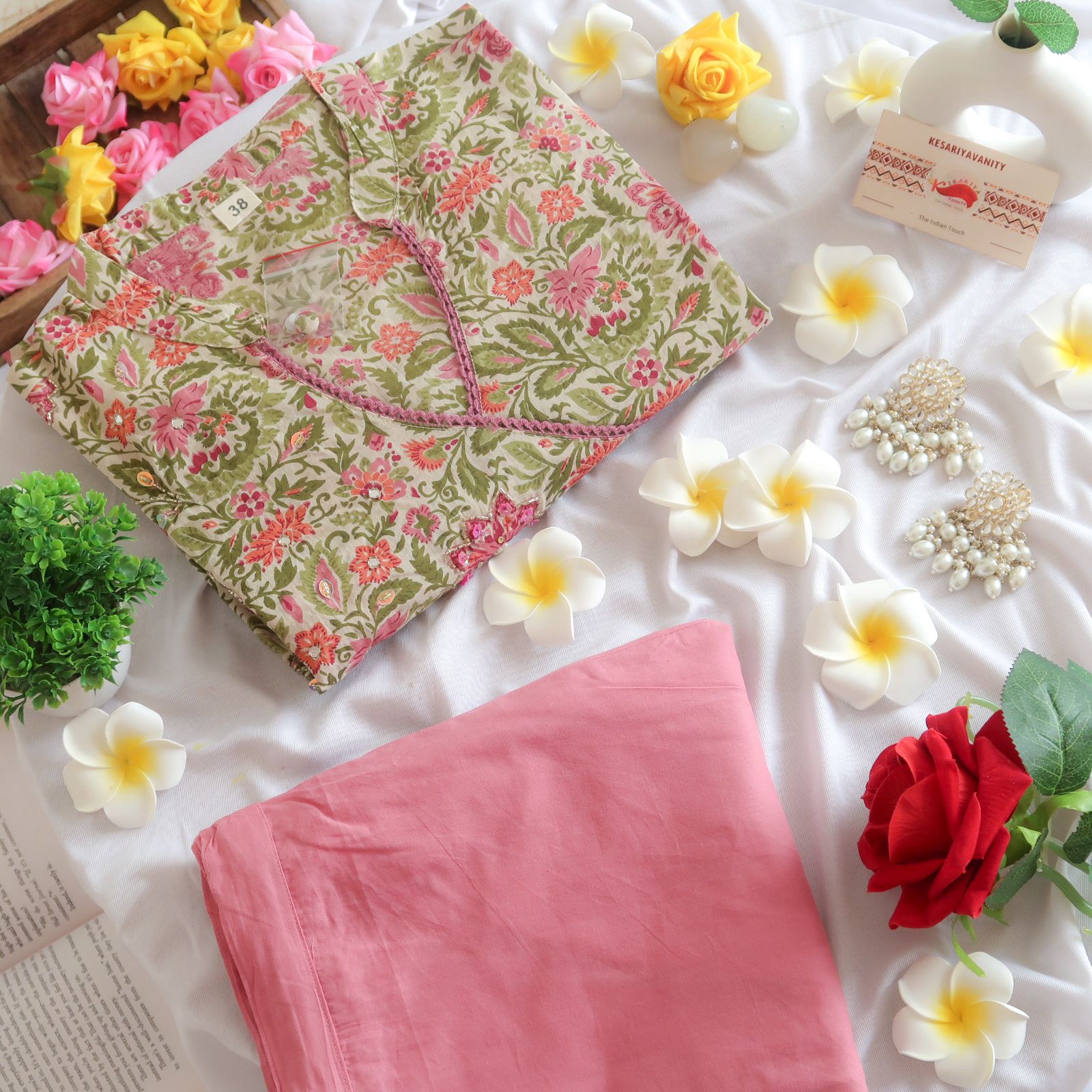 Completing the set are baby pink plain straight pants that perfectly complement the intricate patterns on the kurta. The simplicity of the pants allows the detailed craftsmanship of the kurta to take center stage, ensuring a well-coordinated and effortlessly stylish look.