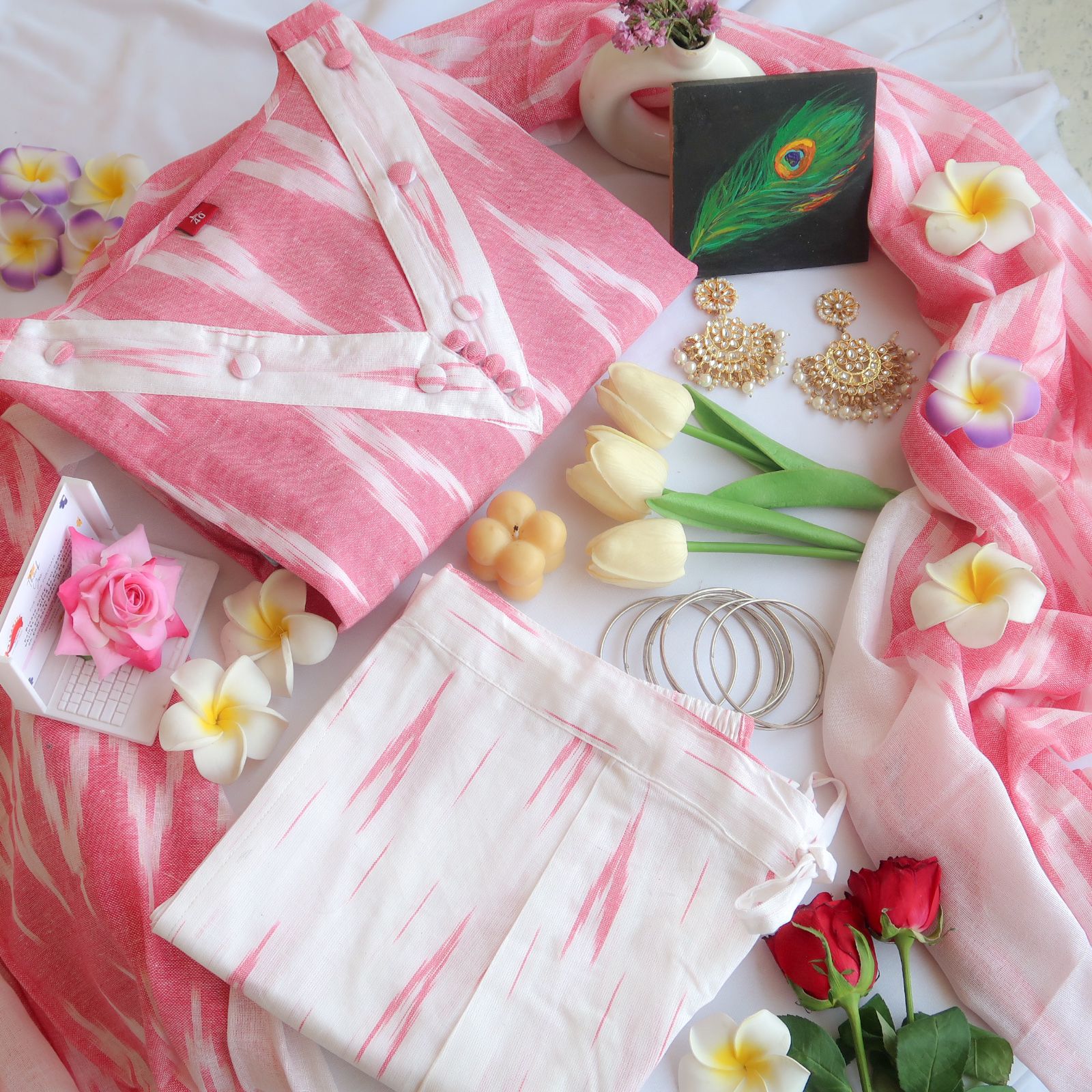 Introducing the epitome of elegance and sophistication: a three-piece suit set that seamlessly blends tradition with contemporary style. Crafted with meticulous attention to detail, the kurta steals the spotlight with its mesmerizing brick red and creamy beige ikat print, exuding an aura of refined charm.