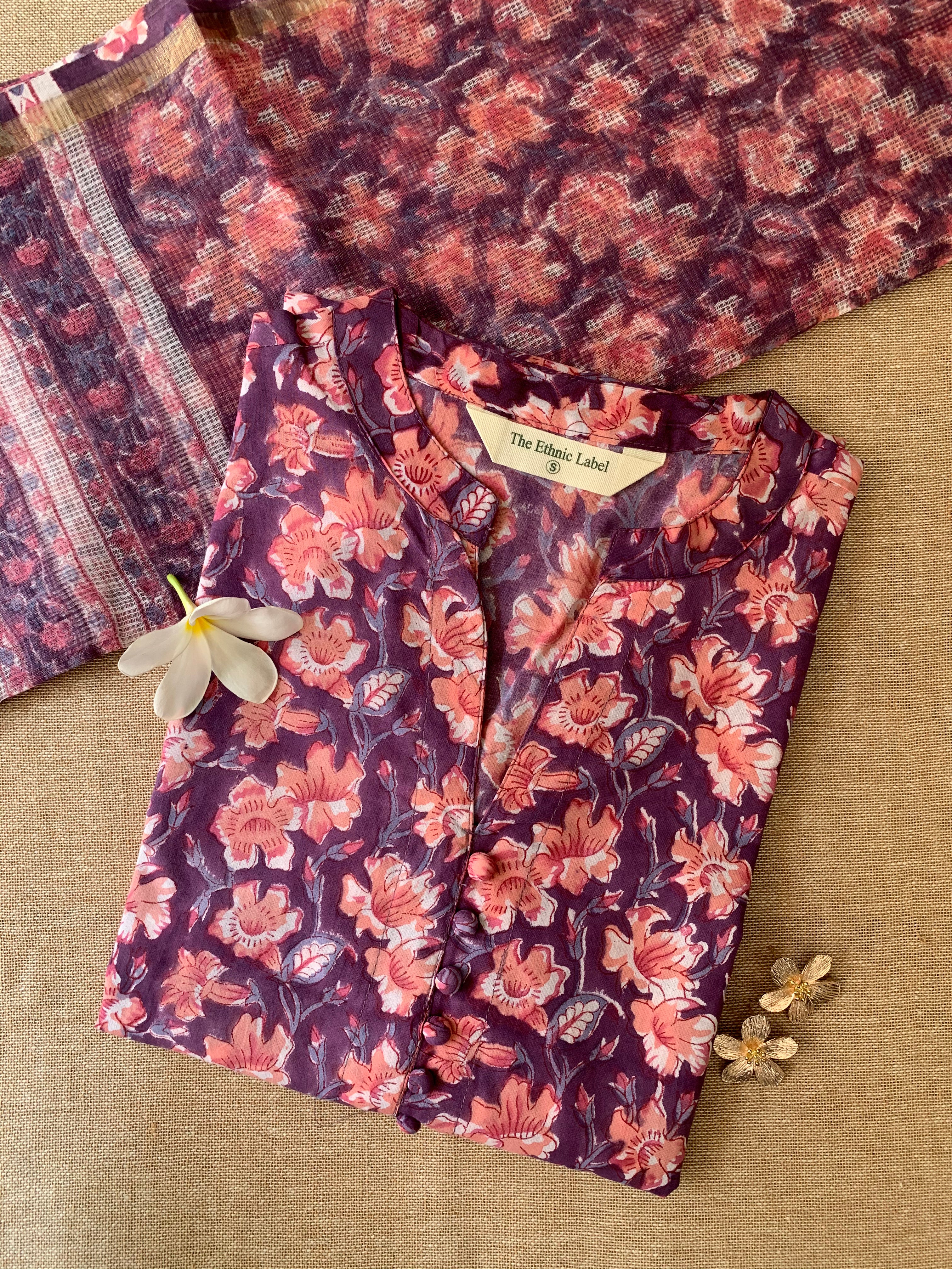 Minimal, classic and chic, this kurta is designed for all the days you want to keep things special and subtle. Inspired by the art of Hand Block Printing, this kurta is a piece of art. The kurta comes with a unique print that gives an elevated touch to its royal colour and pure cotton fabric. The kurta is paired with a beautiful kota doria dupatta adding to the charm of the attire.