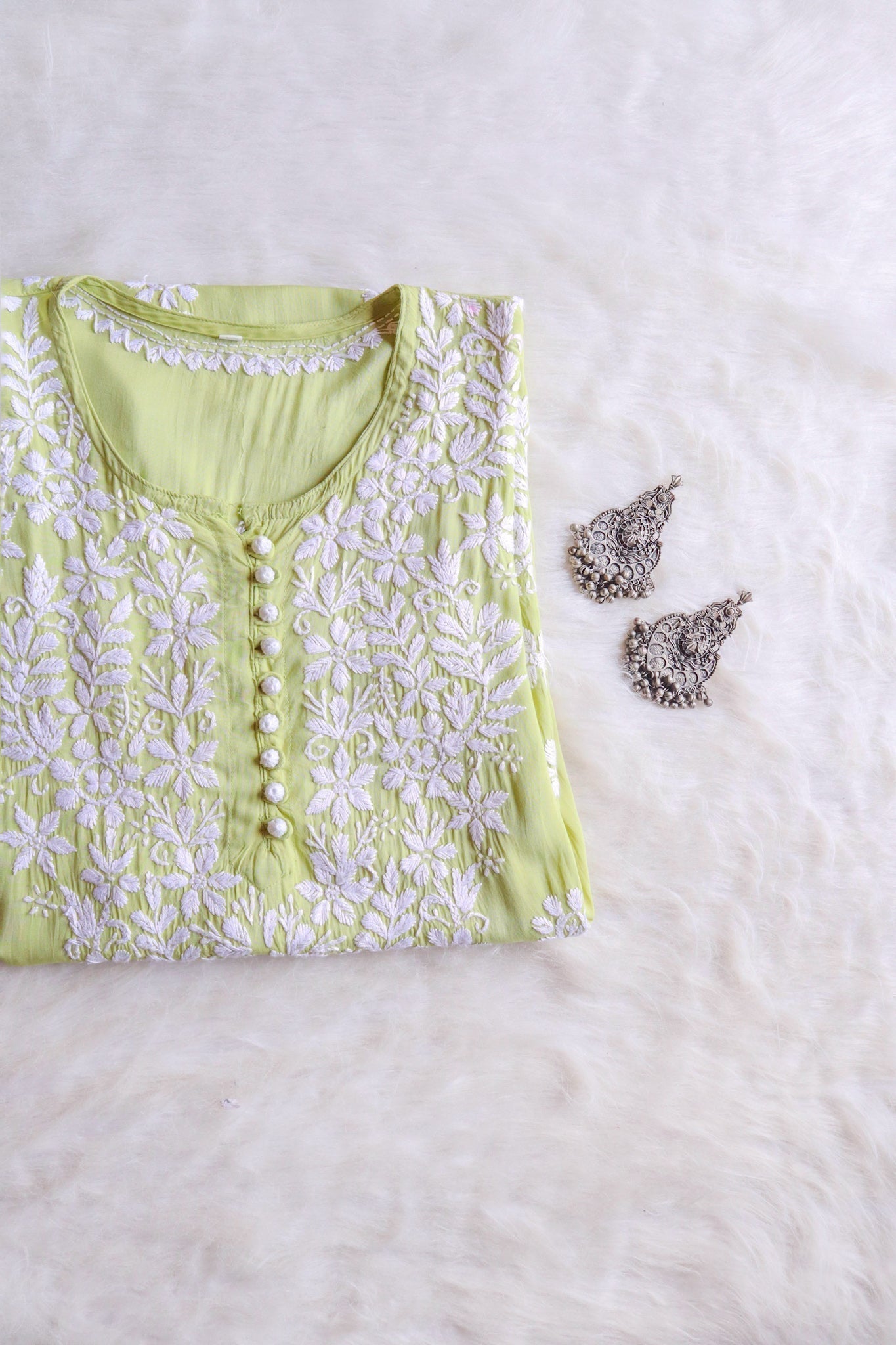 Olive Green Modal long kurta with chikankari handwork in Paisley and Rose Floral pattern in the front with Crotia buttons to elevate the look.
