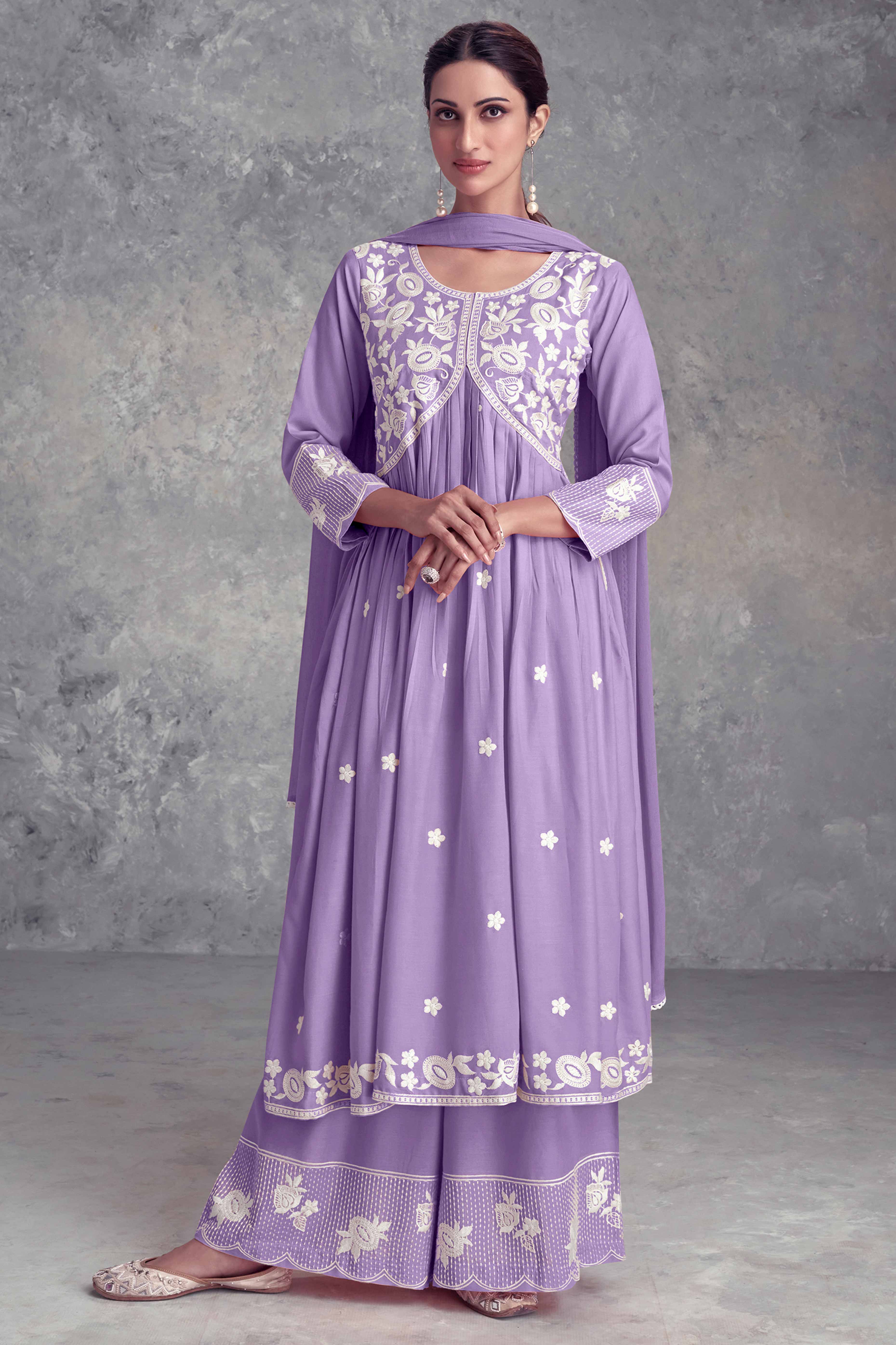 Floral Embroidered Lavender Rayon A-Line Salwar Suit