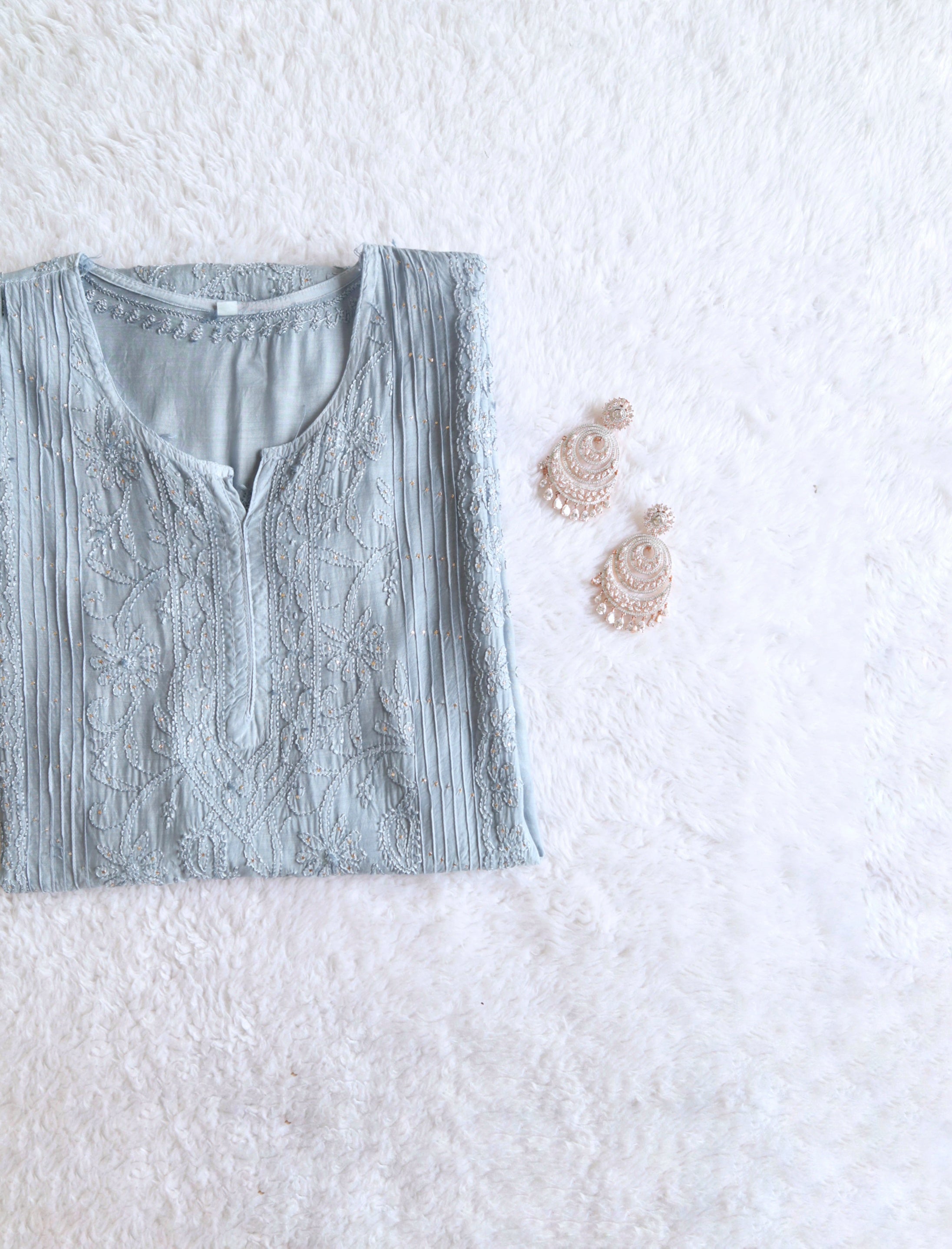 Grey long pure Muslin kurta with chikankari handwork in Leaf and Floral intricate pattern with Mukaish embellishments on the kurta.