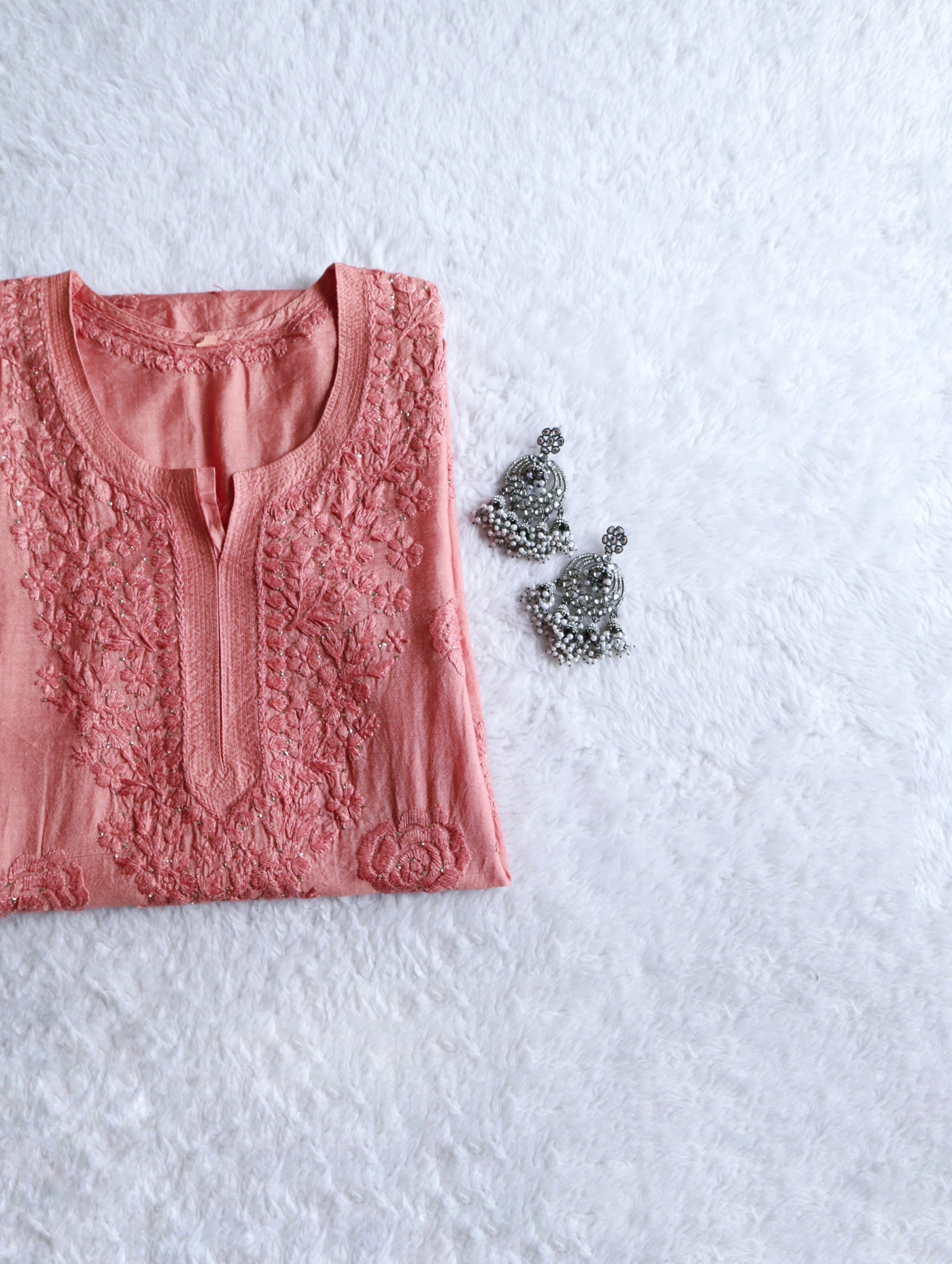 Rose Brown long pure Chanderi kurta with chikankari handwork in Leaf and Floral intricate pattern with Mukaish embellishments on the kurta.