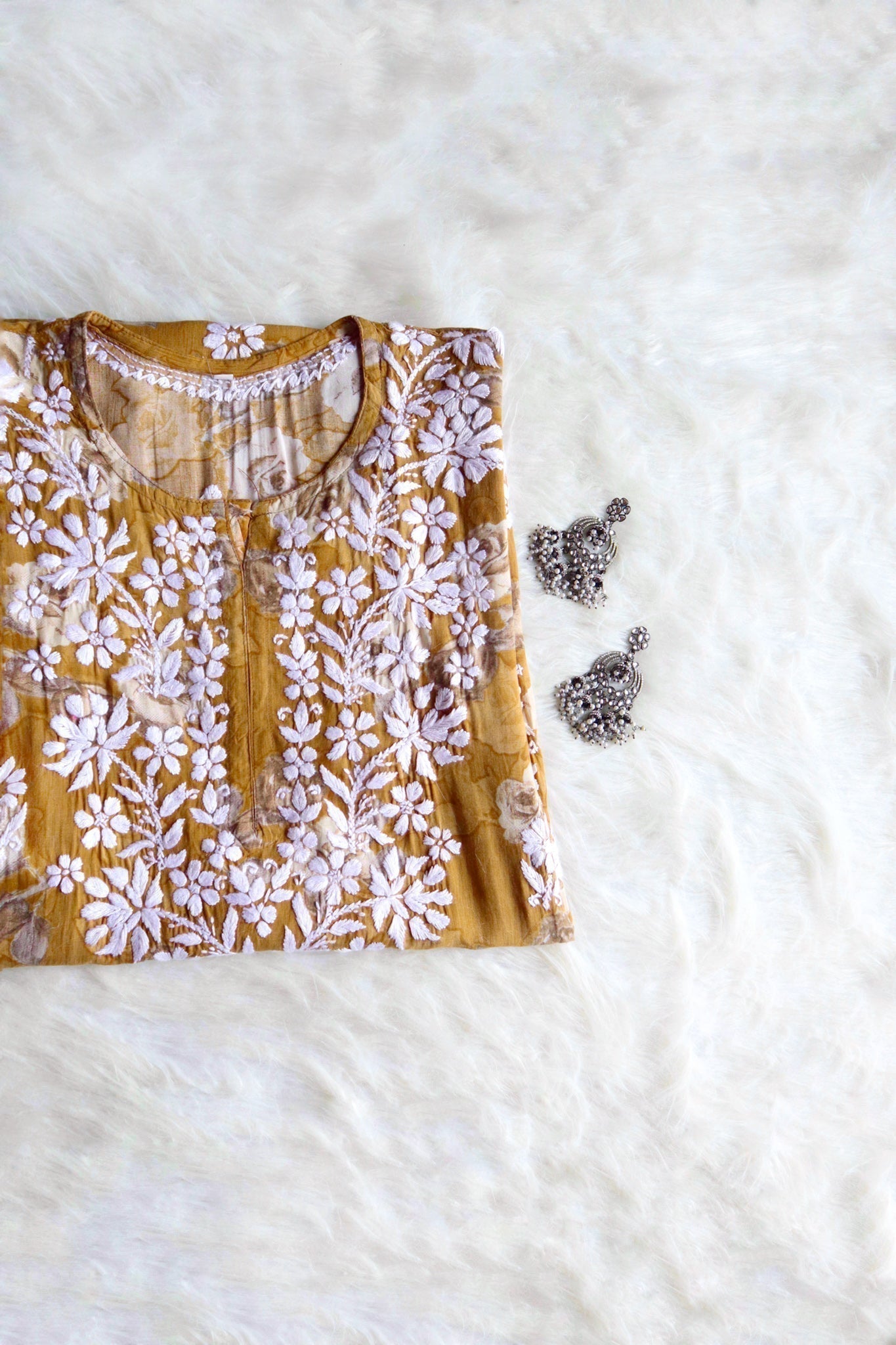 Mustard long kurta with Chikankari handwork in Paisley and Rose pattern in the front on a beautifully printed Modal flowy fabric.
