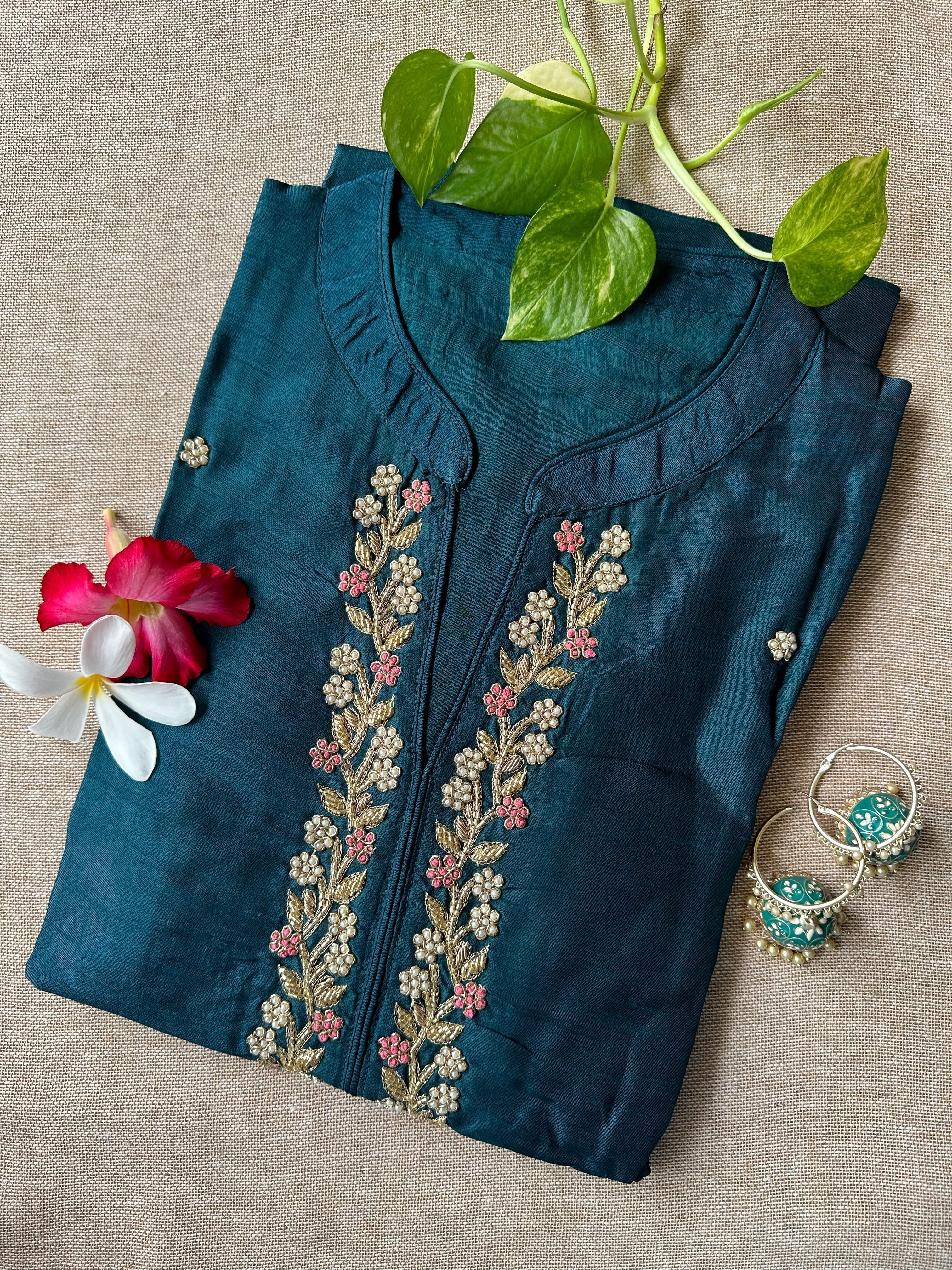 "Meena" Hand Embroidered Turquoise Silk Kurta