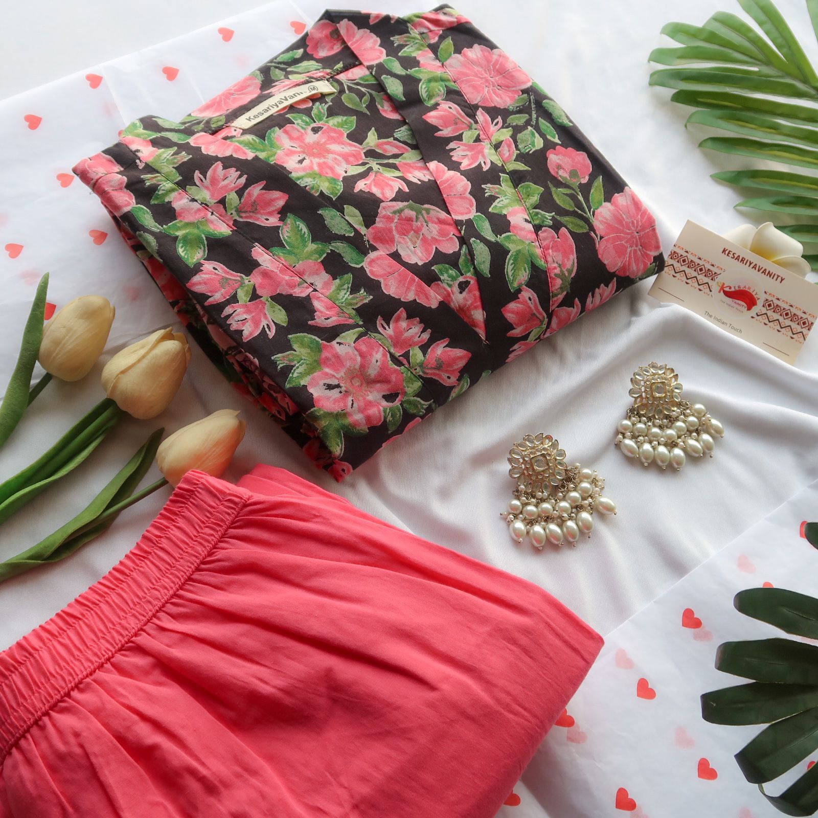 Elevate your wardrobe with our pure cotton kurta and pants set, designed for a striking yet elegant look. The A-line kurta with no side slits features a deep black base, beautifully contrasted by vibrant pink floral prints, creating a stunning visual appeal.