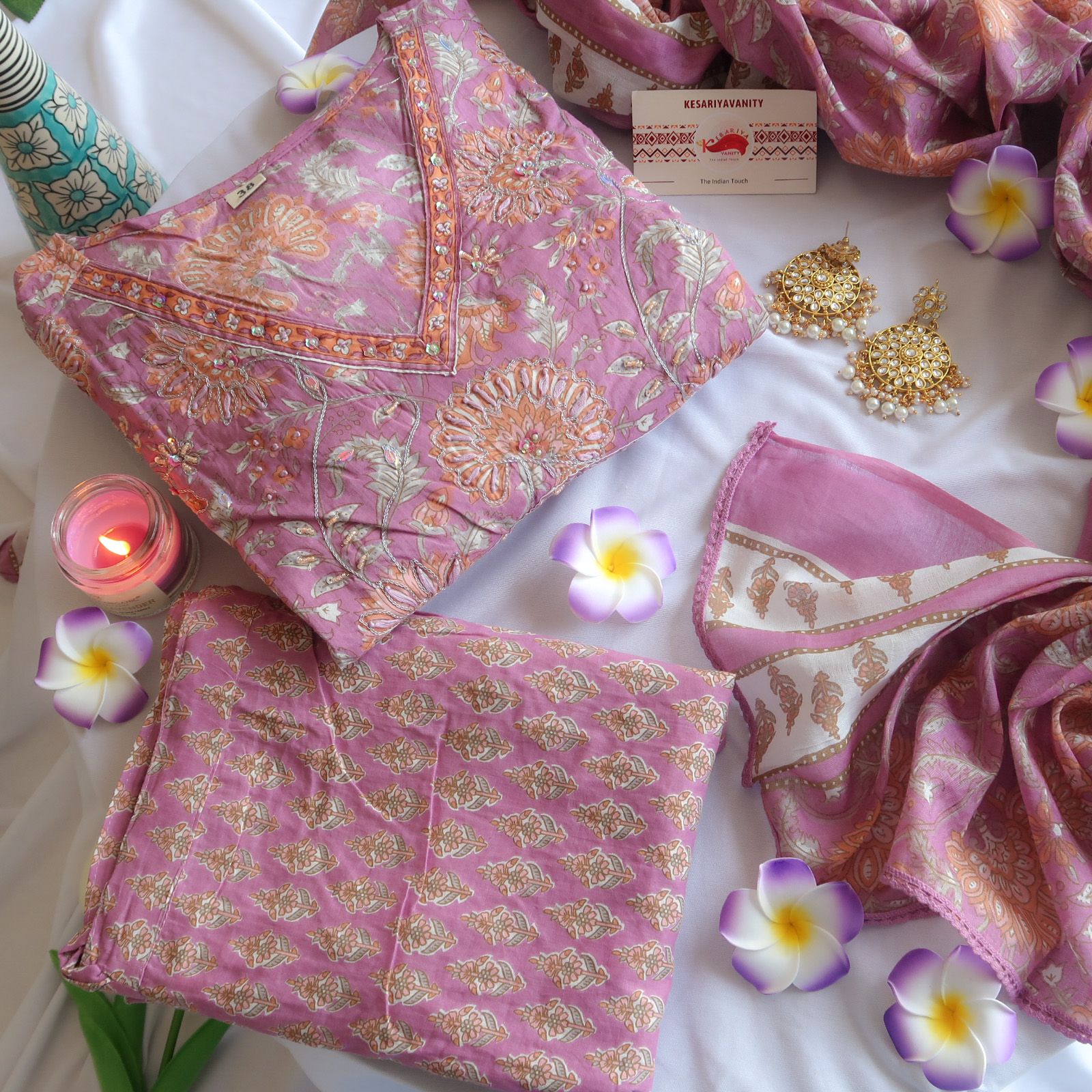 This elegant 3 piece cotton suit set in mauve pink with orange embroidery neck design and floral print is perfect for any special occasion. The kurta features a beautiful mauve pink base with intricate orange embroidery on the neck and flowers printed on the kurta with some embroidery work on it. The mauve pink pants with orange flowers printed on it and mauve pink and off white color dupatta with floral hues complete the look.
