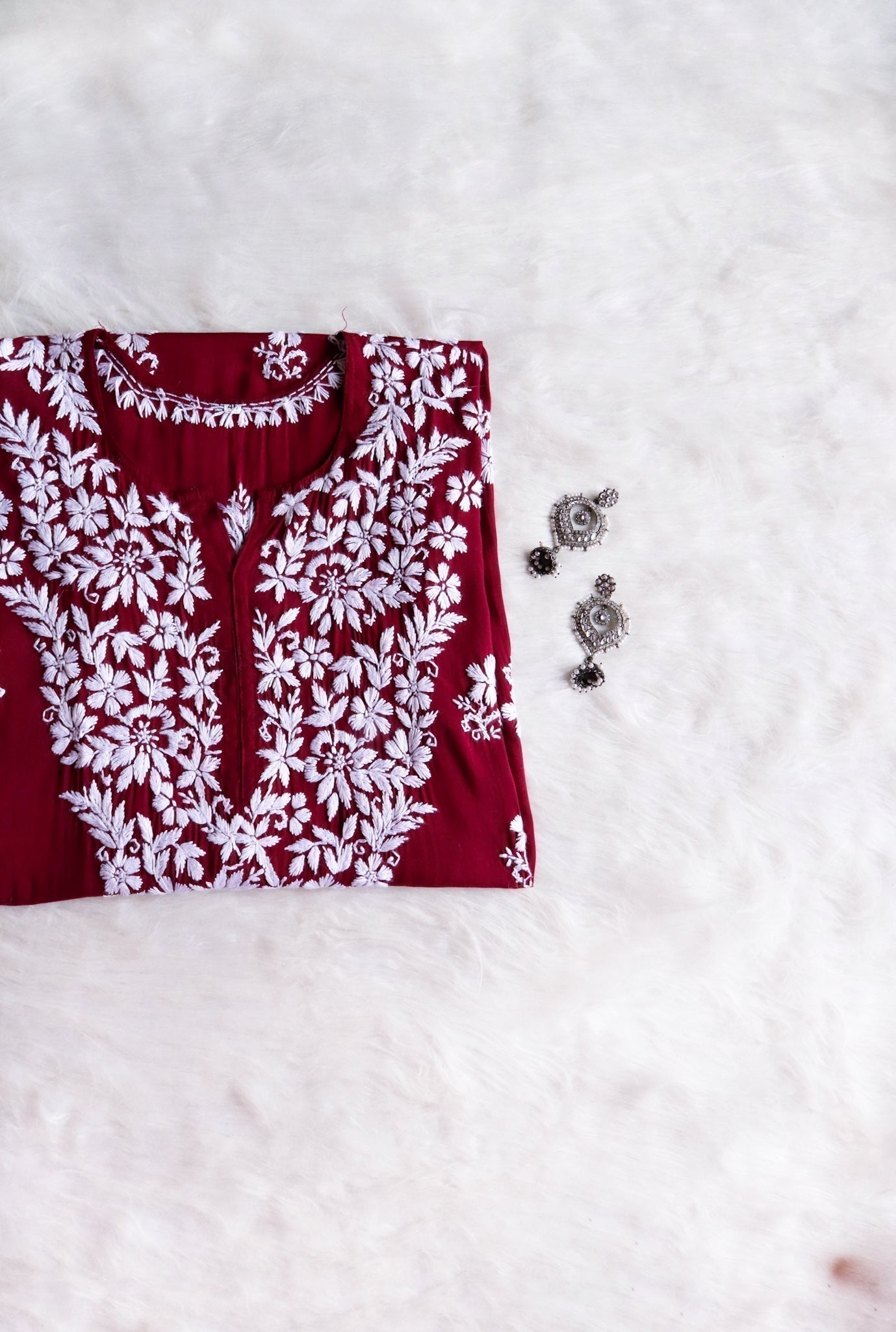 Maroon Modal long kurta with chikankari handwork in Paisley and Rose Floral pattern in the front to elevate the look.