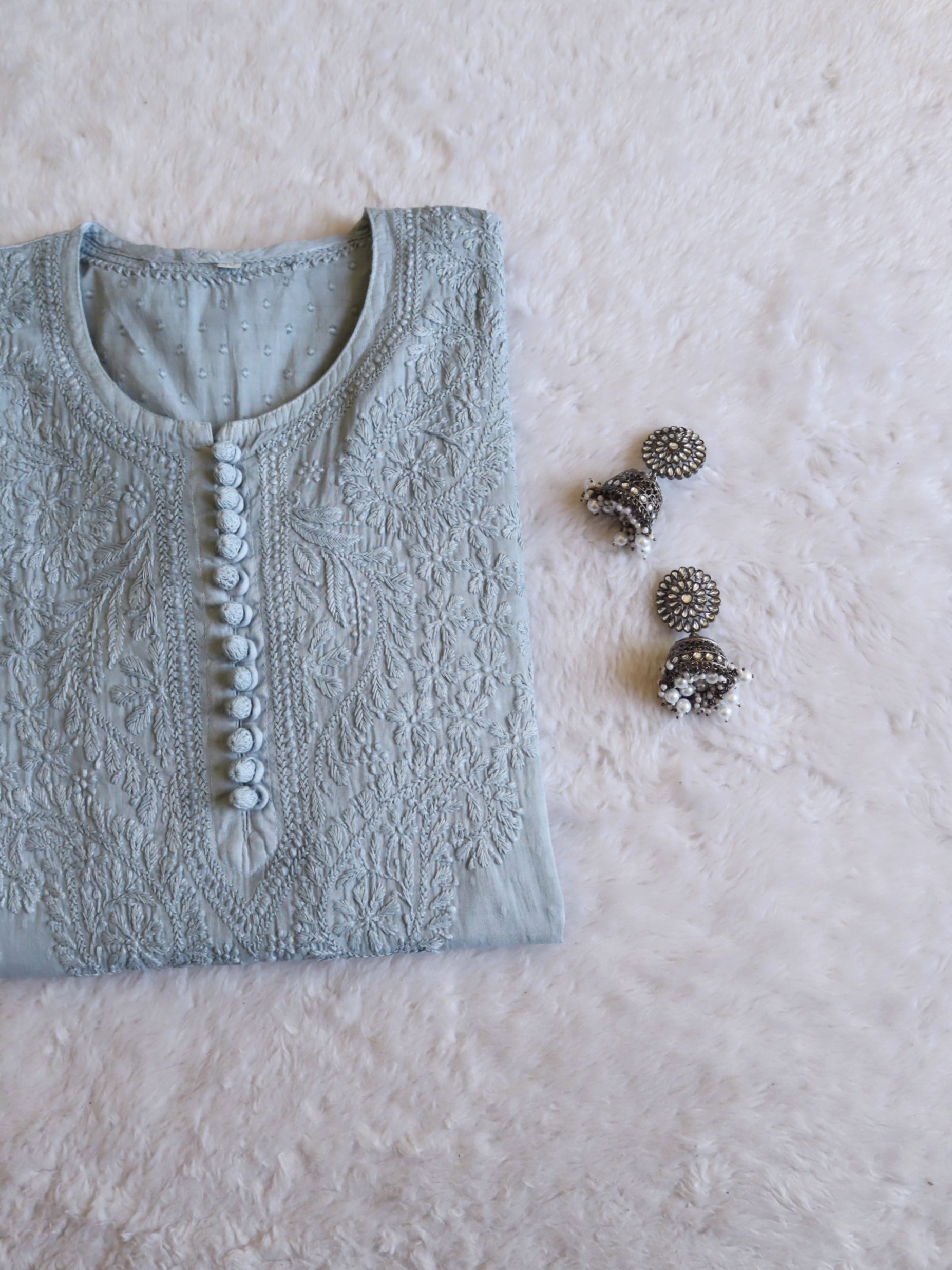 Steel Grey Dolby kurta with chikankari handwork in Paisley and Floral pattern with beautiful crotia buttons in the front to elevate the look. It's a really Serene kurta from our Pastel premium collection with beautiful details! It's perfect and is made for everyone.