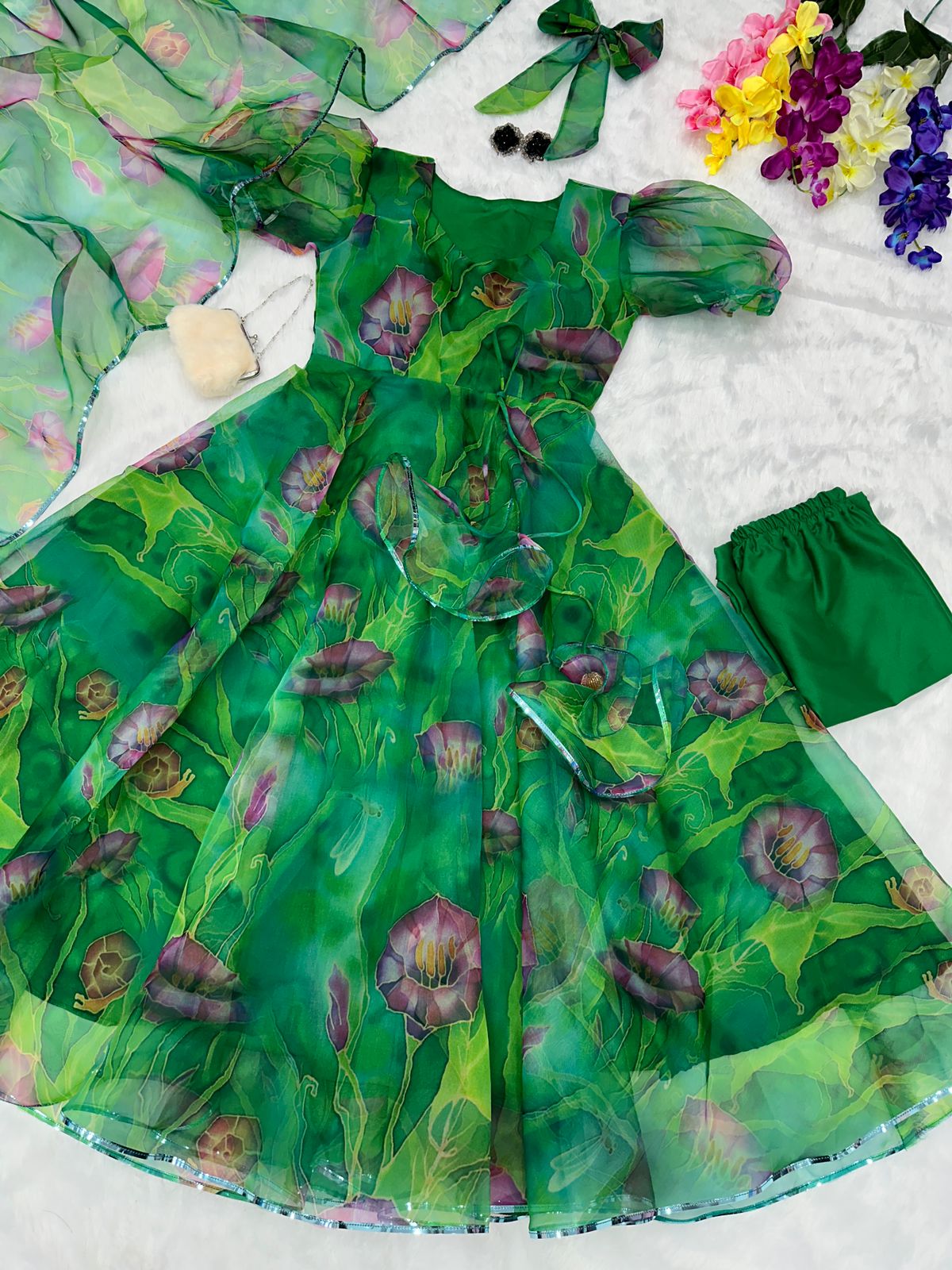 Step into graceful sophistication with this Pure Organza Silk Anarkali Suit, designed to celebrate elegance with every drape. Crafted from luxurious organza silk, the gown showcases digital prints that add a vibrant yet refined touch, complemented by a huge flair with delicate lace border for a stunning flowy silhouette.