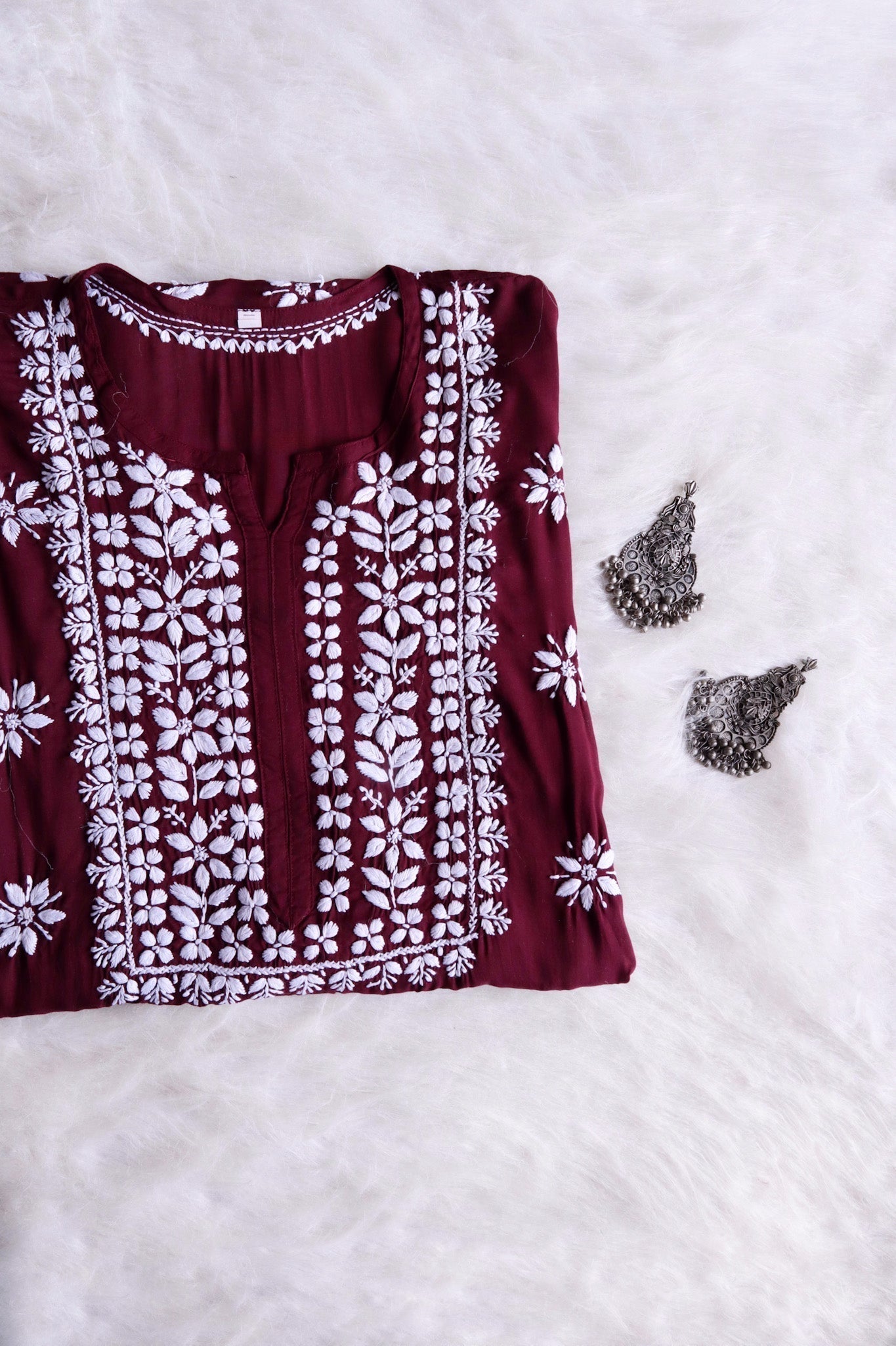 Deep Plum Modal long kurta with chikankari handwork in Paisley and Rose Floral pattern in the front to elevate the look.