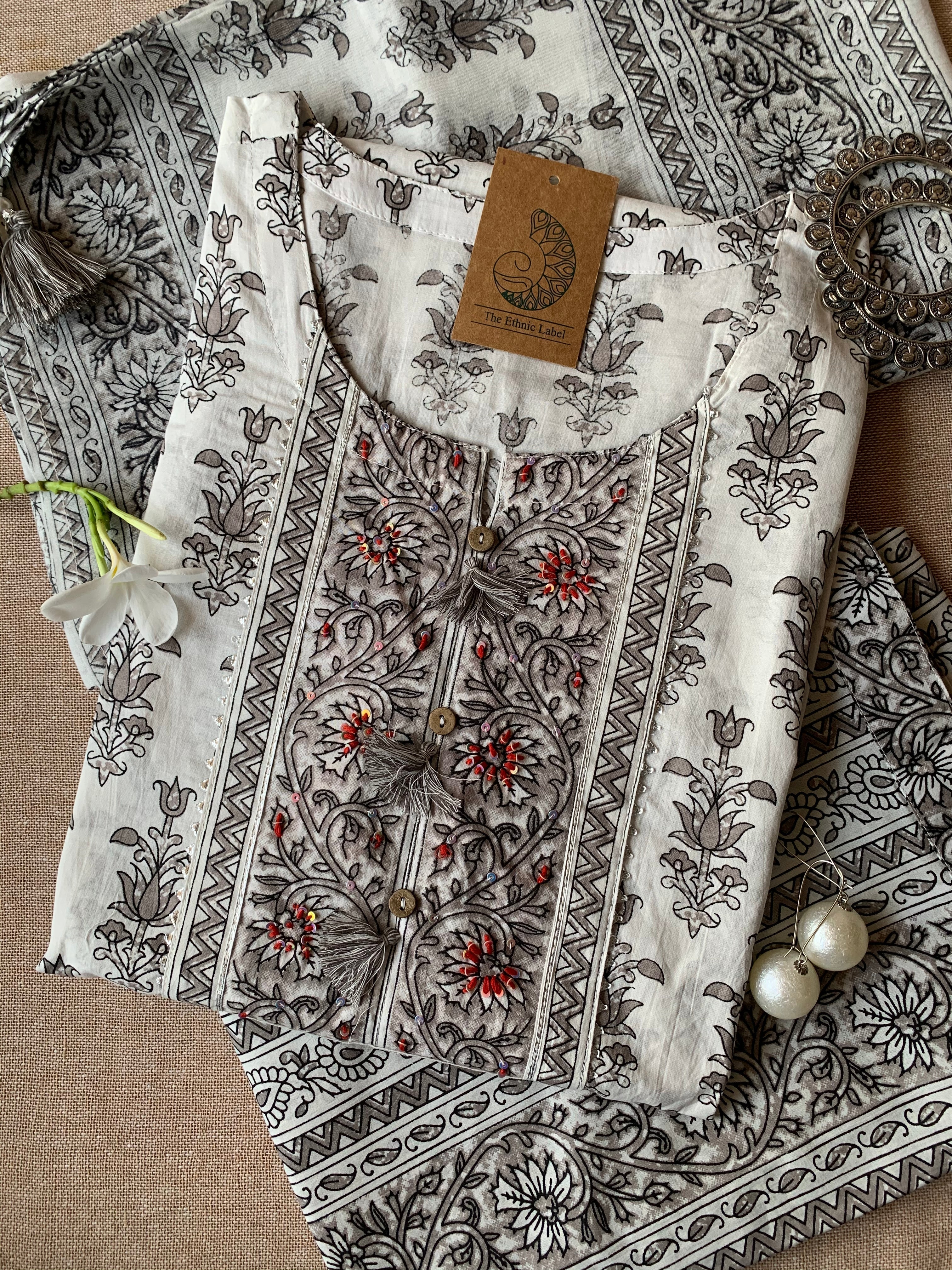 Minimal, classic and chic, this kurta is designed for all the days you want to keep things special and subtle. Inspired by the art of hand block printing, this kurta set is a piece of art. The kurta comes with a unique embroidery work in the yoke that gives an elevated touch to its royal colour and cotton fabric.