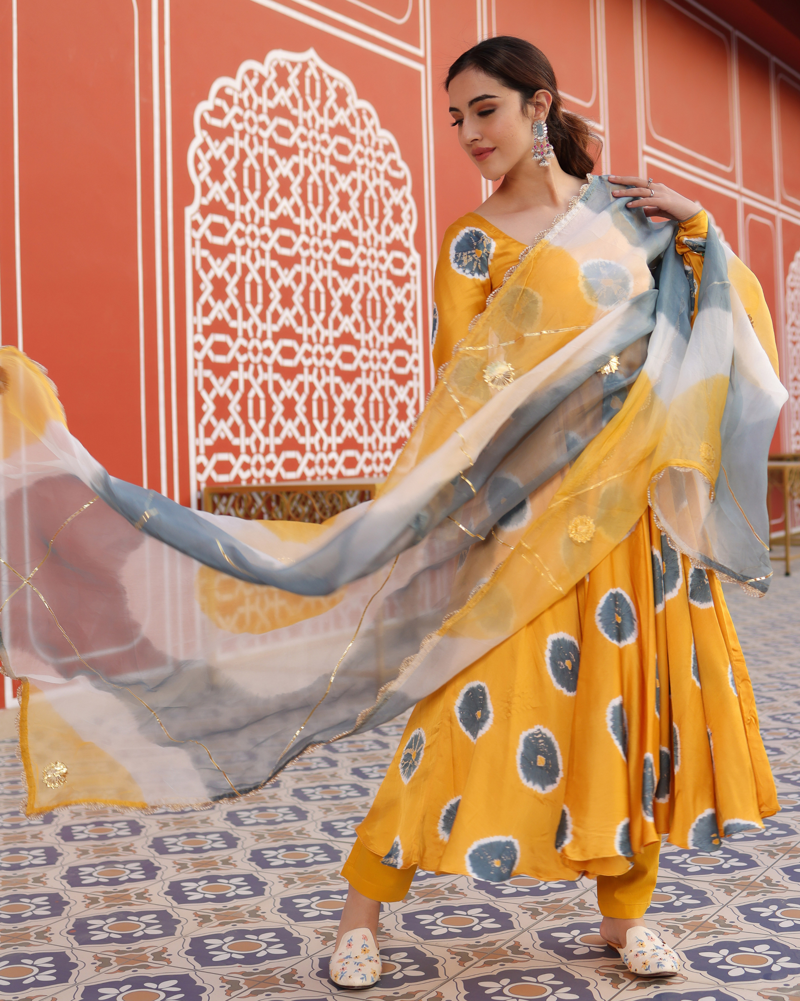 Yellow & Grey Tie- Dye suit set paired with pants and organza dupatta.