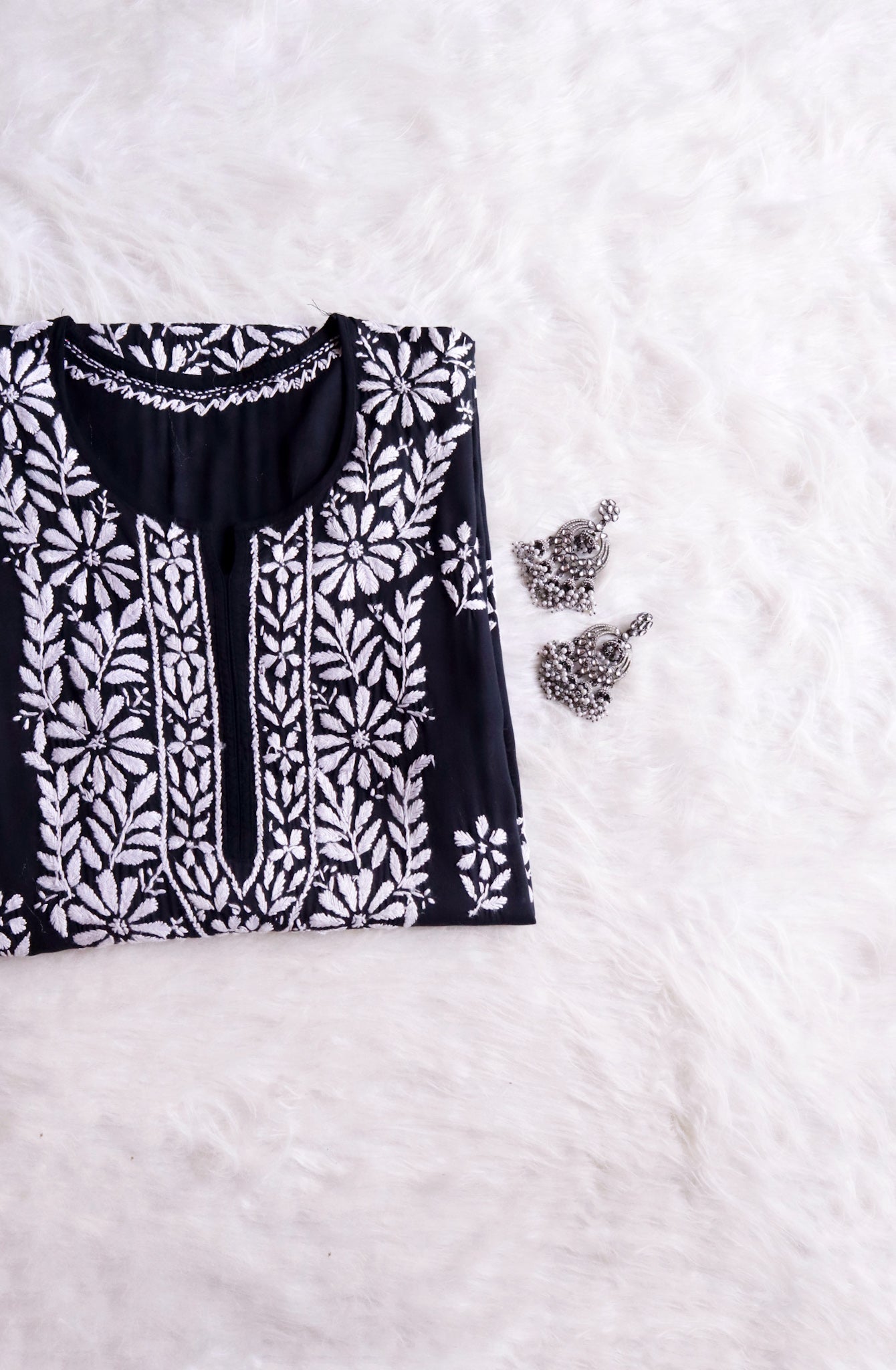 Black Modal long kurta with chikankari handwork in Paisley and Rose Floral pattern in the front to elevate the look.
